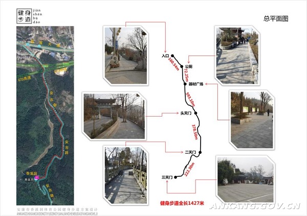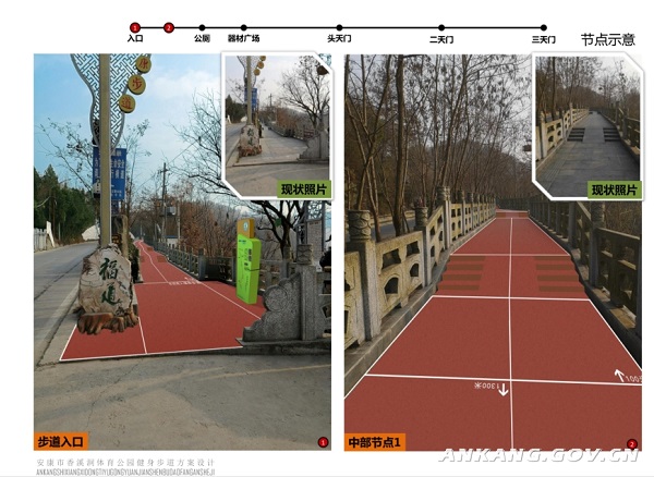 項(xiàng)目實(shí)施地點(diǎn)為安康市香溪洞風(fēng)景區(qū)原有健身步道(水泥路面),北起香溪文化廣場(chǎng)南側(cè),南至香溪洞景區(qū)停車(chē)場(chǎng),全長(zhǎng)約1.5公里,寬度介于2.47—3.72米之間。