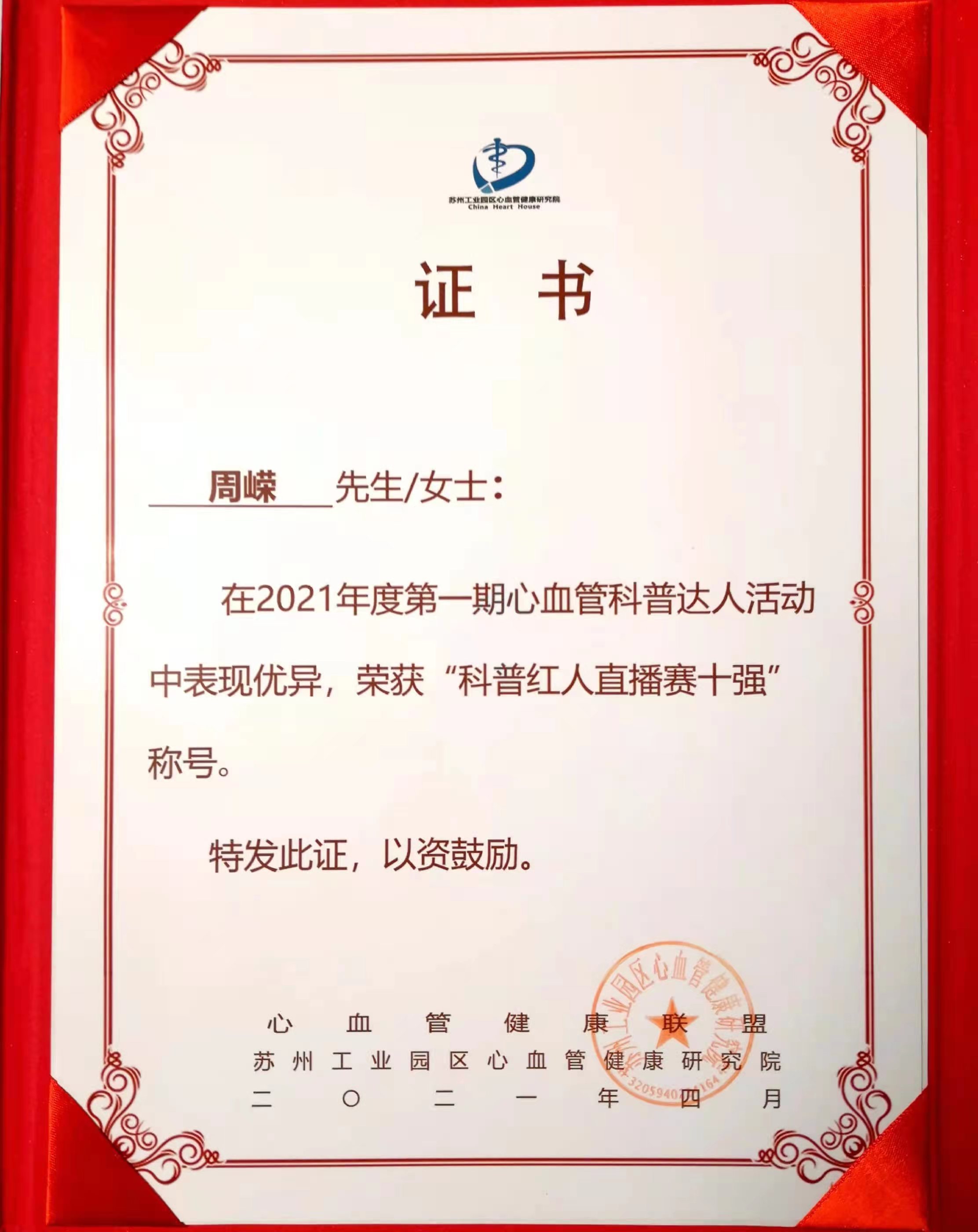 2021年 獲醫(yī)生云獎;獲“科普紅人直播賽十強(qiáng)”稱號