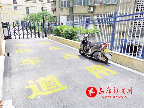 ?6月22日,安康城區(qū)江北江華公司消防通道被摩托車占用(圖1),這一區(qū)域的人行道盲道也被各種車輛侵占(圖2),存在安全隱患。(記者 潘潤(rùn)生 攝)