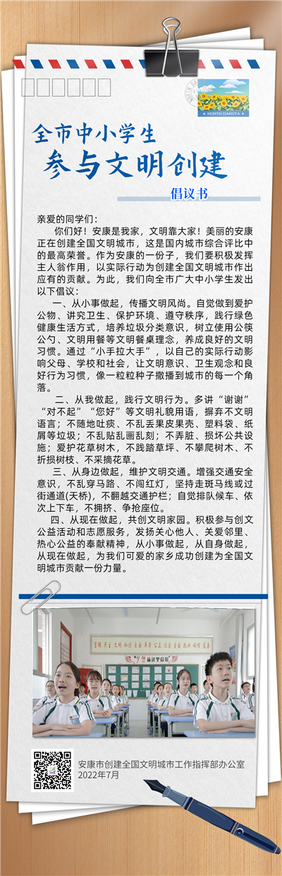 你們好!安康是我家,文明靠大家!美麗的安康正在創(chuàng)建全國文明城市,這是國內(nèi)城市綜合評比中的最高榮譽(yù)。作為安康的一份子,我們要積極發(fā)揮主人翁作用,以實際行動為創(chuàng)建全國文明城市作出應(yīng)有的貢獻(xiàn)。為此,我們向全市廣大中小學(xué)生發(fā)出以下倡議: