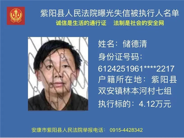 曝光失信 | 紫陽縣人民法院:關(guān)于敦促儲德清履行法定義務的公告