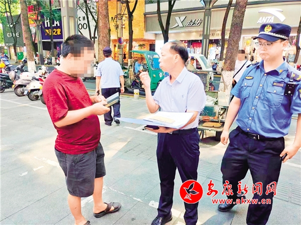 7月18日上午,漢濱城管執(zhí)法分局“‘痰’吐文雅,舉‘紙’得體”糾治組在金州路、白天鵝廣場(chǎng)以及公交車站附近巡查值守,對(duì)取證發(fā)現(xiàn)的隨地吐痰不文明行為進(jìn)行法規(guī)宣傳教育,并采取罰款、微信朋友圈發(fā)公益廣告集贊等形式給予糾治。李東 攝
