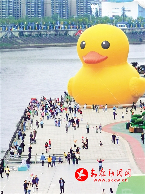 國(guó)慶期間,安康城區(qū)漢江公園一只大大的“黃鴨”成為了市民新的打卡地。吳定國(guó) 攝