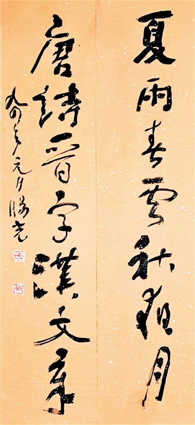 旸光先生淵博的家學(xué),深厚的學(xué)養(yǎng)為其書法技藝開掘出流淌不盡的源泉,正是他那非凡的經(jīng)歷與盤踞胸中的郁勃之氣,鑄就了別具一格的藝術(shù)風(fēng)采??v觀先生書法字里行間的布局、結(jié)構(gòu)、章法,即可以領(lǐng)略其高深的藝術(shù)修養(yǎng)。一般書法家給自己作品題款尚膽怯,更何況給山水畫人物、花鳥畫題款署名,書寫跋語,要求書者不但有深厚的文學(xué)功底賦詞作詩,再根據(jù)畫面的風(fēng)格,畫中所留空白虛實(shí)照應(yīng),用筆用墨的變化去應(yīng)對,好的款跋使作品升華。而先生無論行、草、隸、篆,縱橫涂抹,信手拈來如行云流水,宛若天成,令人折服,先生曾為不少后學(xué)作品撰寫款名,跋語至今記憶猶新。