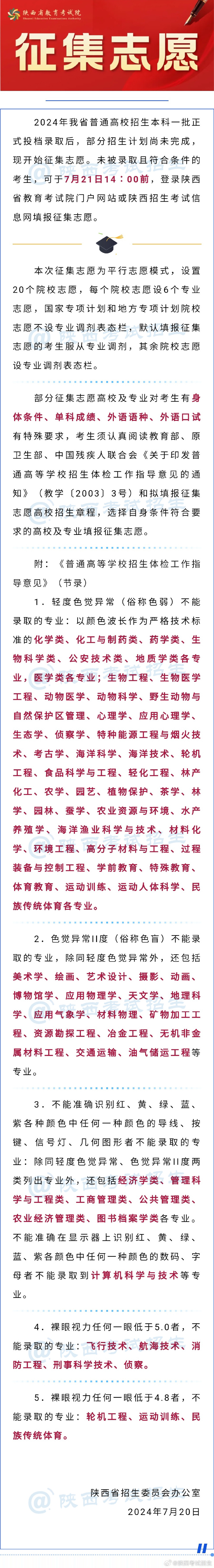 2024年我省普通高校招生本科一批正式投檔錄取后,部分招生計(jì)劃尚未完成,現(xiàn)開(kāi)始征集志愿。未被錄取且符合條件的考生,可于7月21日14∶00前,登錄陜西省教育考試院門戶網(wǎng)站或陜西招生考試信息網(wǎng)填報(bào)征集志愿。