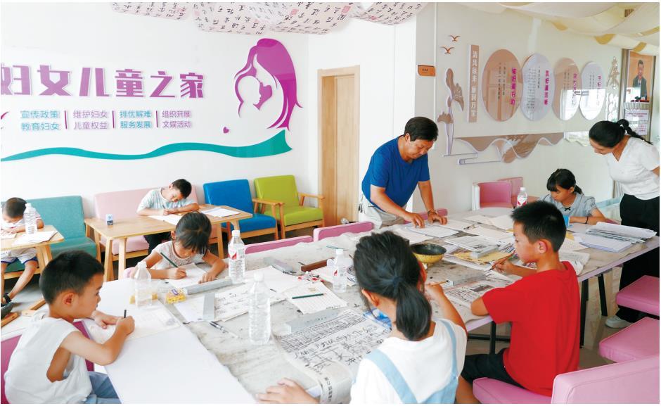 8月12日,塘坊壩社區(qū)聯合子中心,兒童在練習書法。