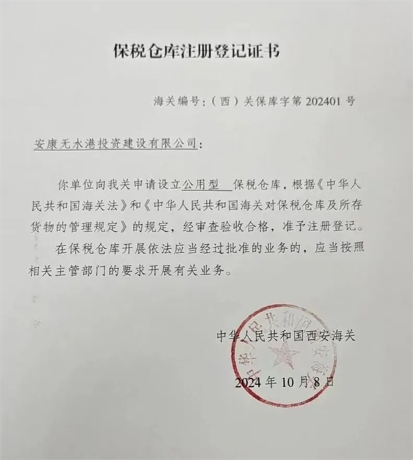10月8日,由恒口示范區(qū)申請設(shè)立的“公用型保稅倉庫”正式通過海關(guān)審查驗收,成功獲得由西安海關(guān)頒發(fā)的《保稅倉庫注冊登記證書》,標志著該保稅倉已具備正式運營資質(zhì)和能力,可正式對外開展實際業(yè)務。