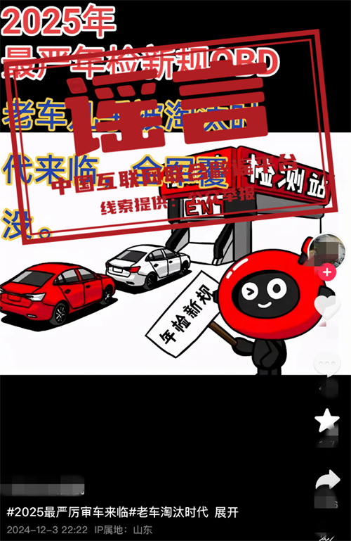 真相:近日,多個(gè)自媒體賬號(hào)發(fā)布消息,宣稱“史上最嚴(yán)車檢來(lái)了”“車檢年限變化”“燃油車年檢增加OBD檢測(cè)”等。中央廣電總臺(tái)中國(guó)之聲記者多方求證了解到,上述說(shuō)法均為不實(shí)消息,目前各地車檢并沒(méi)有新變化。