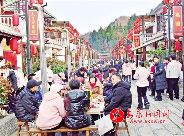 “開席啰……”隨著一聲鑼響,充滿儀式感的省級非遺庖湯盛宴正式開始。古色古香的店鋪門頭掛滿紅燈籠,石板鋪成的長街上,賓客8人一桌圍爐而坐,道道美食依次上席,說菜人“口吐蓮花”,菜越說越香;酒歌高亢,越喝越暖;猜拳行令,秦巴漢子盡顯豪邁風采;作坊小鎮(zhèn)高朋滿座,滿滿年味十里香飄。