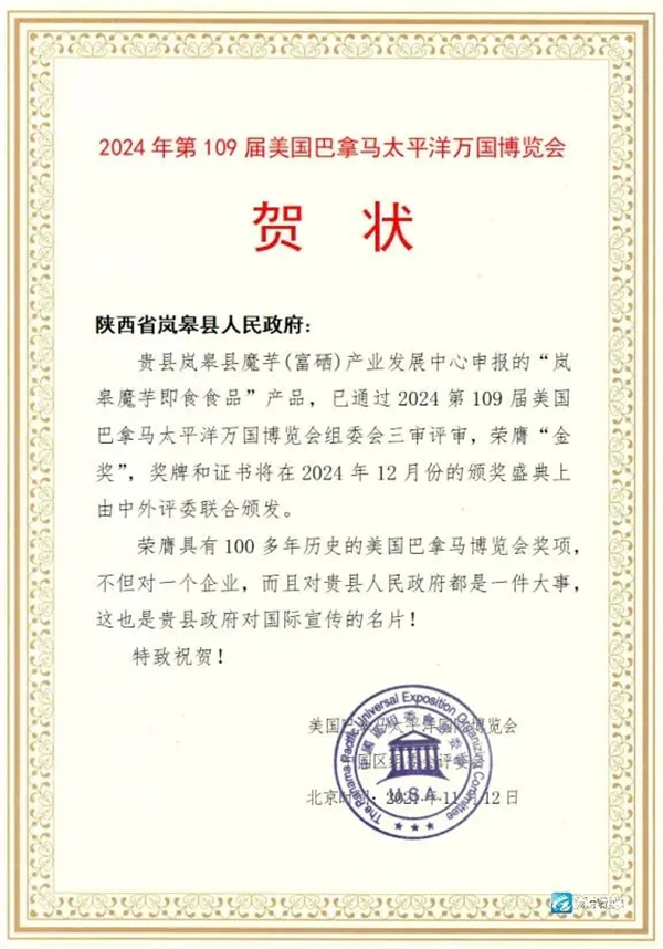 1月8日,筆者從泰國曼谷舉行的2024年第109屆美國巴拿馬太平洋萬國博覽會頒獎盛典上獲悉,由嵐皋縣魔芋產(chǎn)業(yè)發(fā)展中心申報的“嵐皋魔芋即食食品”,榮膺2024年第109屆美國巴拿馬太平洋萬國博覽會“金獎”。