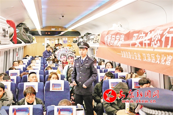 火車(chē)穿越秦巴山水間,途中,來(lái)自安康漢調(diào)二黃研究院的專(zhuān)業(yè)演員和地方民間漢調(diào)二黃愛(ài)好者們一同表演了國(guó)家級(jí)非物質(zhì)文化遺產(chǎn)——漢調(diào)二黃經(jīng)典戲曲演唱,并為旅客們講解漢調(diào)二黃戲曲知識(shí),與旅客們開(kāi)展互動(dòng)交流,讓旅客親身體驗(yàn)漢調(diào)二黃戲服道具,感受漢調(diào)二黃的獨(dú)特藝術(shù)魅力。來(lái)自漢濱區(qū)文化館的漢濱剪紙技藝傳承人為旅客們展示講解了安康市級(jí)非物質(zhì)文化遺產(chǎn)——漢濱剪紙技藝,向參與互動(dòng)的旅客送上了親手創(chuàng)作的漢濱剪紙作品,提前送上新春祝福?;顒?dòng)中,西安鐵路公安局安康公安處的民警們和文藝工作者們一同宣傳普及了反詐知識(shí),進(jìn)一步提升旅客的安全防范意識(shí)。