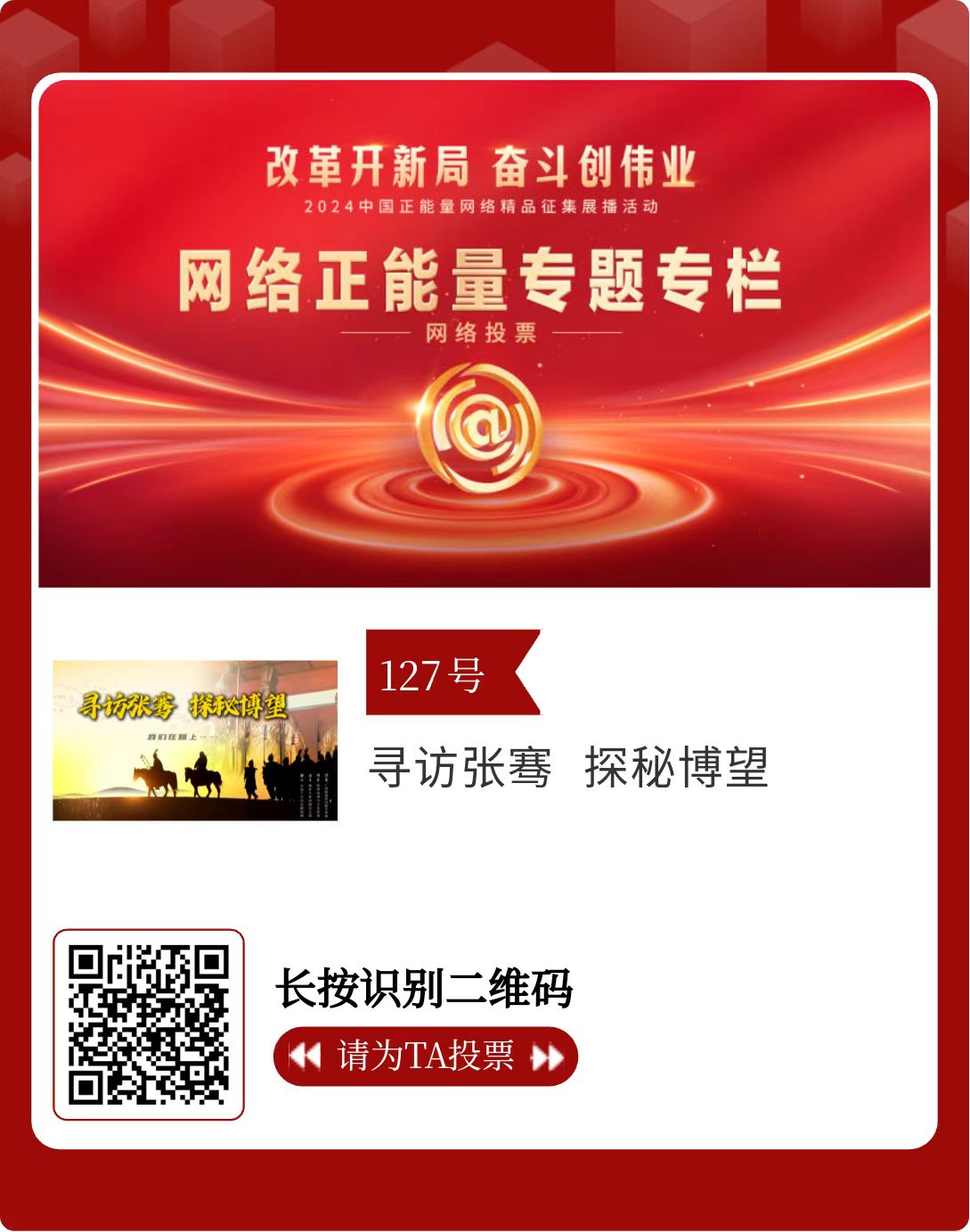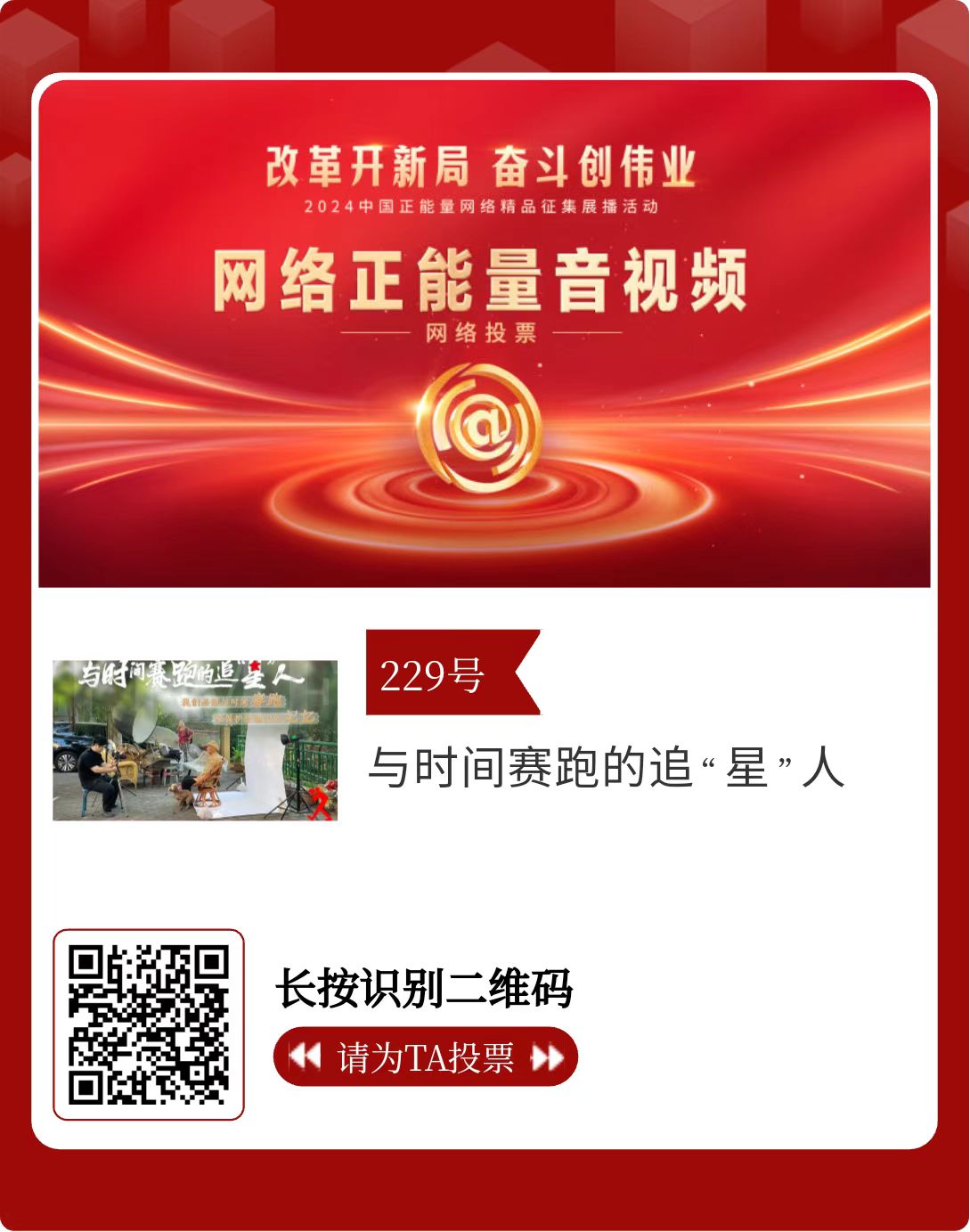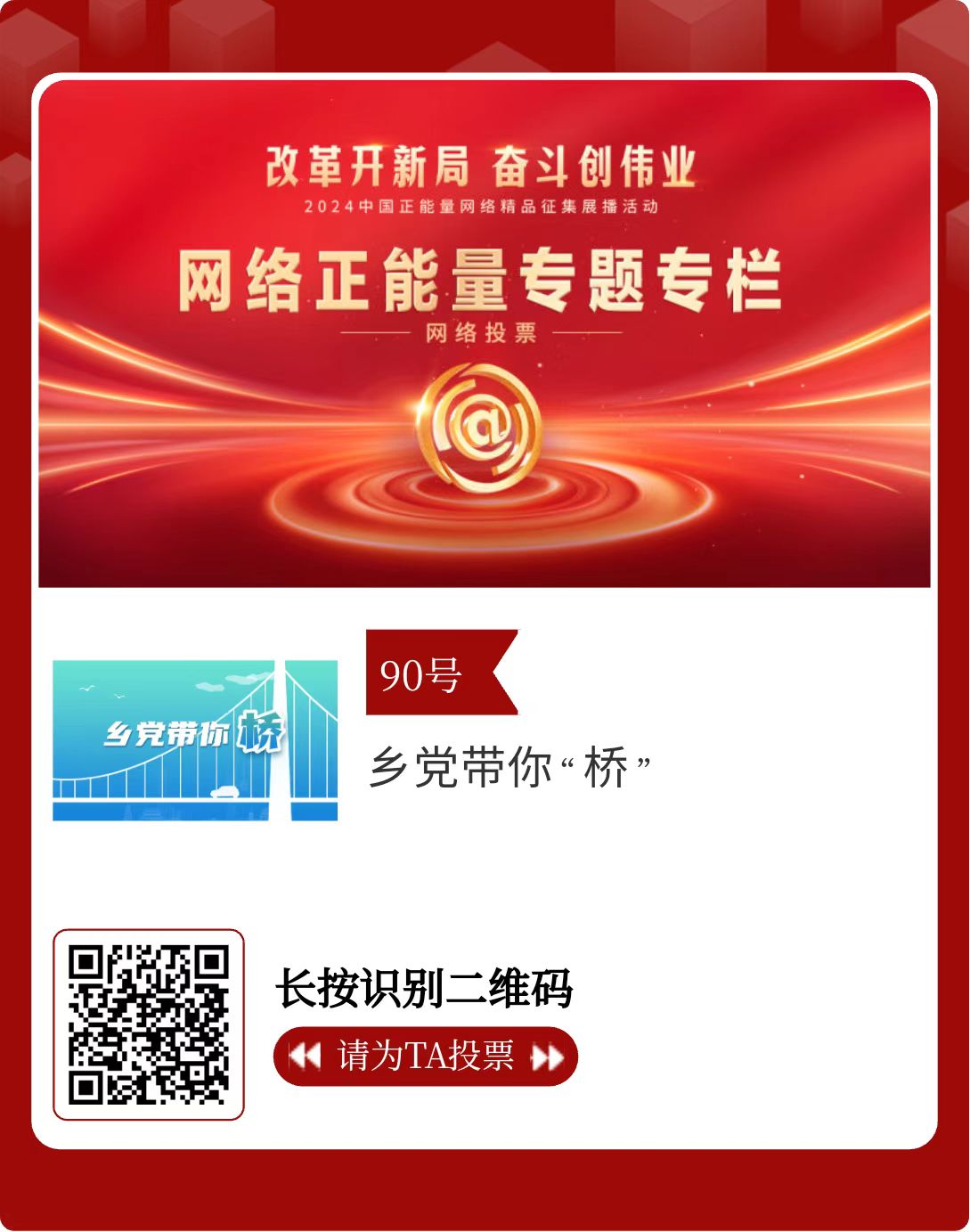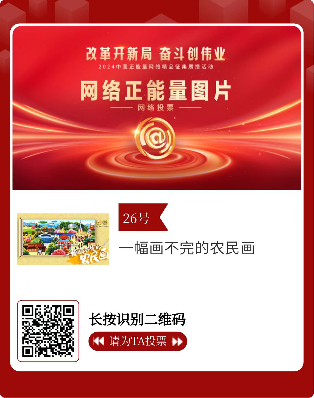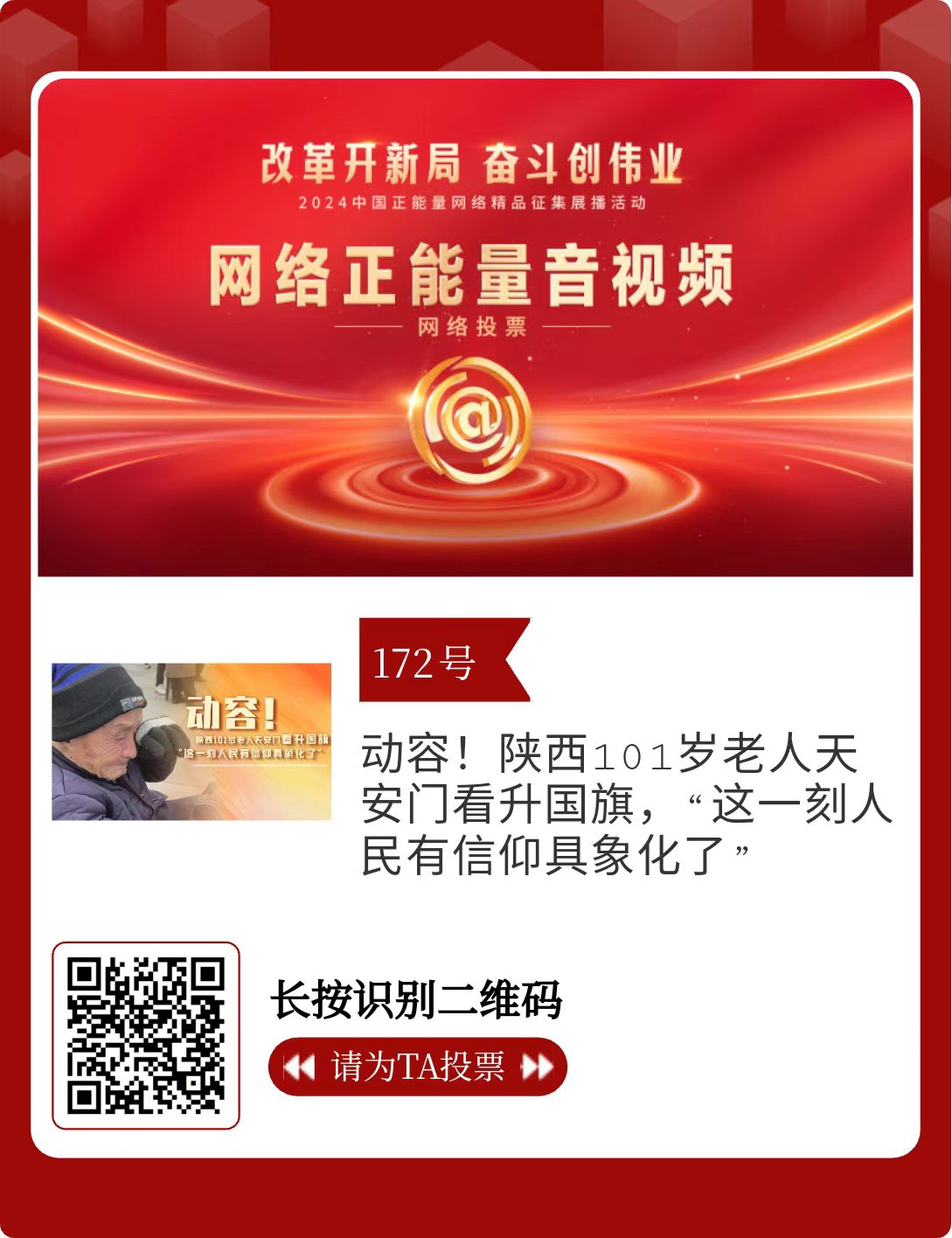 改革開新局,奮斗創(chuàng)偉業(yè)。由中央網(wǎng)信辦主辦的2024中國正能量網(wǎng)絡精品征集展播活動今天啟動網(wǎng)絡展播投票。