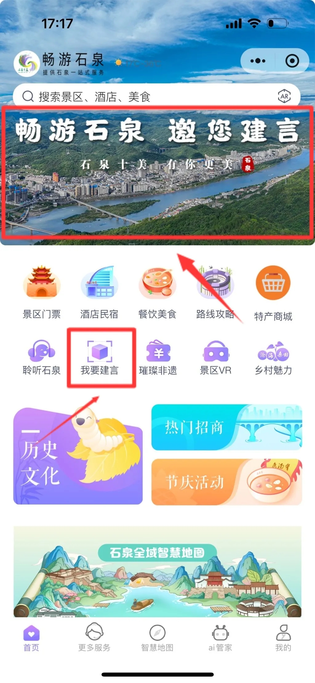 1.官方賬號:打開“暢游石泉”小程序,點(diǎn)擊“暢游石泉 邀您建言”意見建議征集頁面,提交建議。