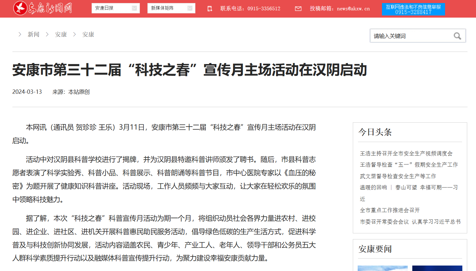 黨的二十大報告指出,培育創(chuàng)新文化,弘揚科學家精神,涵養(yǎng)優(yōu)良學風,營造創(chuàng)新氛圍。為推動全民科學素質全面提升,鼓勵全社會關注科學創(chuàng)新,形成崇尚科學的良好氛圍,安康新聞網通過“全國科普日集中宣傳”等主題宣傳,持續(xù)發(fā)布一系列民生科普報道,切實增強科學知識在群眾中的普及率,取到了良好的社會效果。