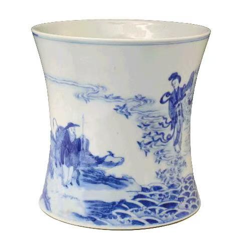 山東博物館收藏的清光緒青花七夕卷筒,也描繪了牛郎織女在天河上即將相會(huì)的情景。卷筒圖案中,祥云繚繞、喜鵲飛舞,鵲橋很快就會(huì)搭成。一年未見,牛郎拱手準(zhǔn)備,對(duì)即將到來(lái)的見面迫不及待;織女衣袂飄飄,含情脈脈地望著日夜思念的牛郎。畫中人物清麗灑脫、典雅高貴,器物主題鮮明、藝術(shù)性較高,真可謂秦觀筆下“金風(fēng)玉露一相逢,便勝卻人間無(wú)數(shù)”的生動(dòng)注解。