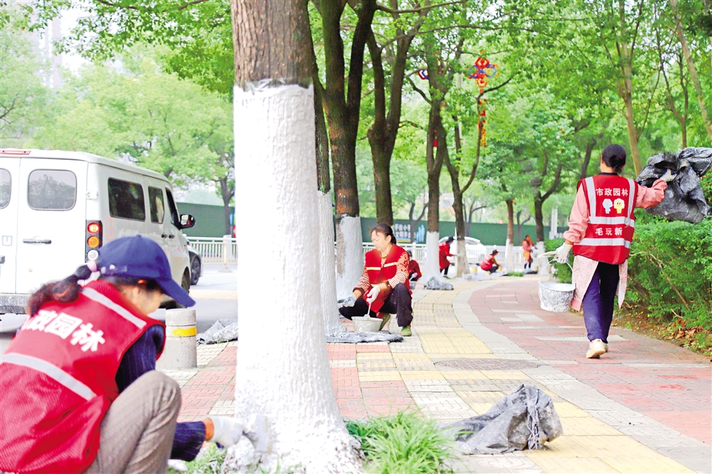 “刷白不是簡(jiǎn)單的涂涂畫畫,得兼顧效果與顏值。”現(xiàn)場(chǎng)管護(hù)負(fù)責(zé)人周宏安介紹,作業(yè)中嚴(yán)格執(zhí)行統(tǒng)一標(biāo)準(zhǔn),采用涂白劑、石硫合劑、水按20∶1∶10配比的藥劑,在每棵樹上標(biāo)定基準(zhǔn)線,確保涂白高度控制在1米至1.2米之間,做到上口平齊、下不露“腳”。針對(duì)樹皮縫隙、孔洞等關(guān)鍵部位,工人們反復(fù)涂刷,同時(shí)全程做好防護(hù),避免藥劑外濺污染路面與樹穴,實(shí)現(xiàn)“防護(hù)到位、環(huán)境整潔”雙重目標(biāo)。