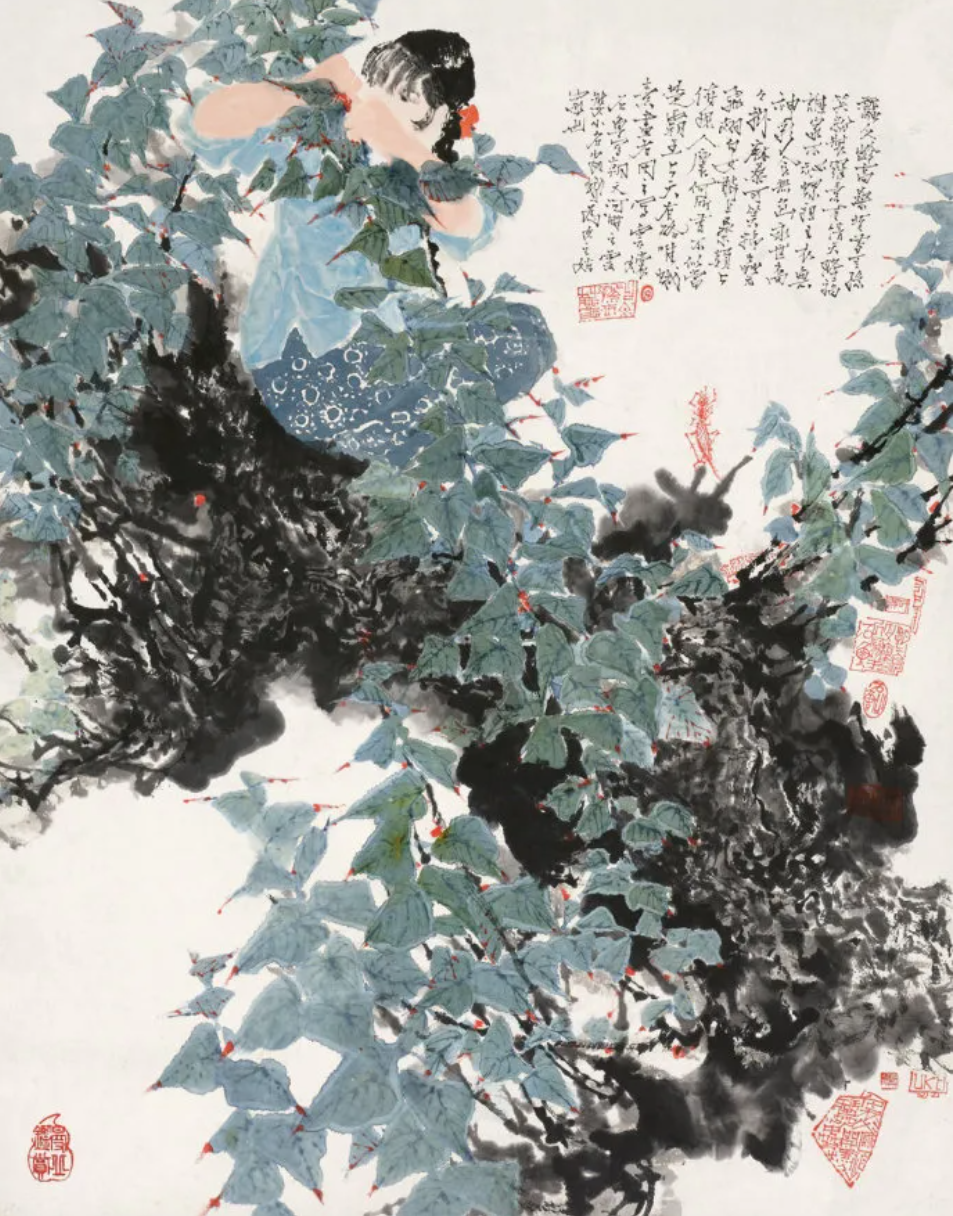 題識:蠶女齡喬桑,昔有王孫笑粉妝。羅素有情天降福,誰家不秘王祖。衣無神采食無魚,永世商裔掛麻桑??尚γ尴x無飛翅,白女敢上桑顛上。俯視人寰何所有,不似當(dāng)(年)楚霸王。上天有路唯蛾素,畫者因之寫云。石魯寫朝天河畔之云婆,小名安蛾,為女之姑家也?!恫缮D》,2010春拍成交價1064萬元。