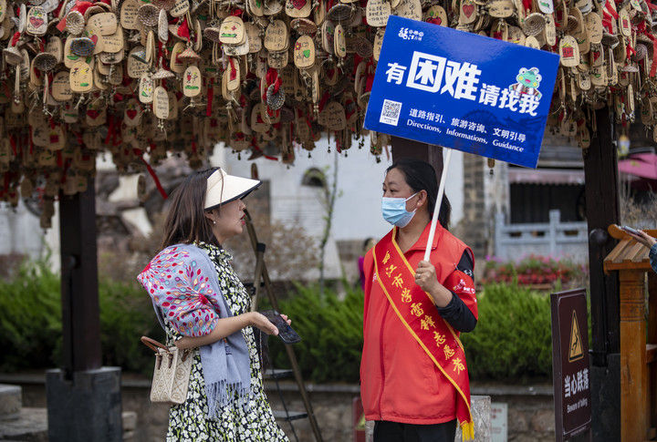 2023年5月18日,一名游客(左)在麗江古城向志愿者咨詢。2015年12月,云南麗江古城保護(hù)管理局牽頭成立了麗江古城旅游志愿者服務(wù)隊,志愿者主要來自市區(qū)機(jī)關(guān)單位、古城保護(hù)管理局、古城經(jīng)營戶、在校學(xué)生、社區(qū)居民等,常年在古城內(nèi)提供旅游咨詢、道路指引、文明引導(dǎo)等志愿服務(wù)。