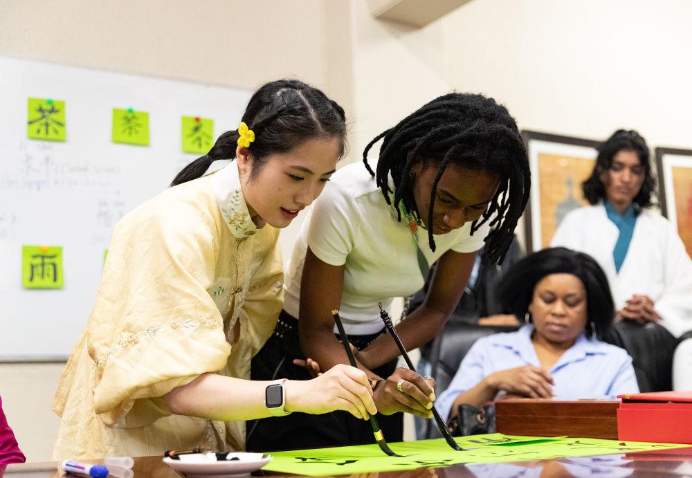△2025年4月17日,在南非約翰內(nèi)斯堡,學(xué)生與孔子學(xué)院志愿者在“國(guó)際中文日”活動(dòng)上寫(xiě)毛筆字。