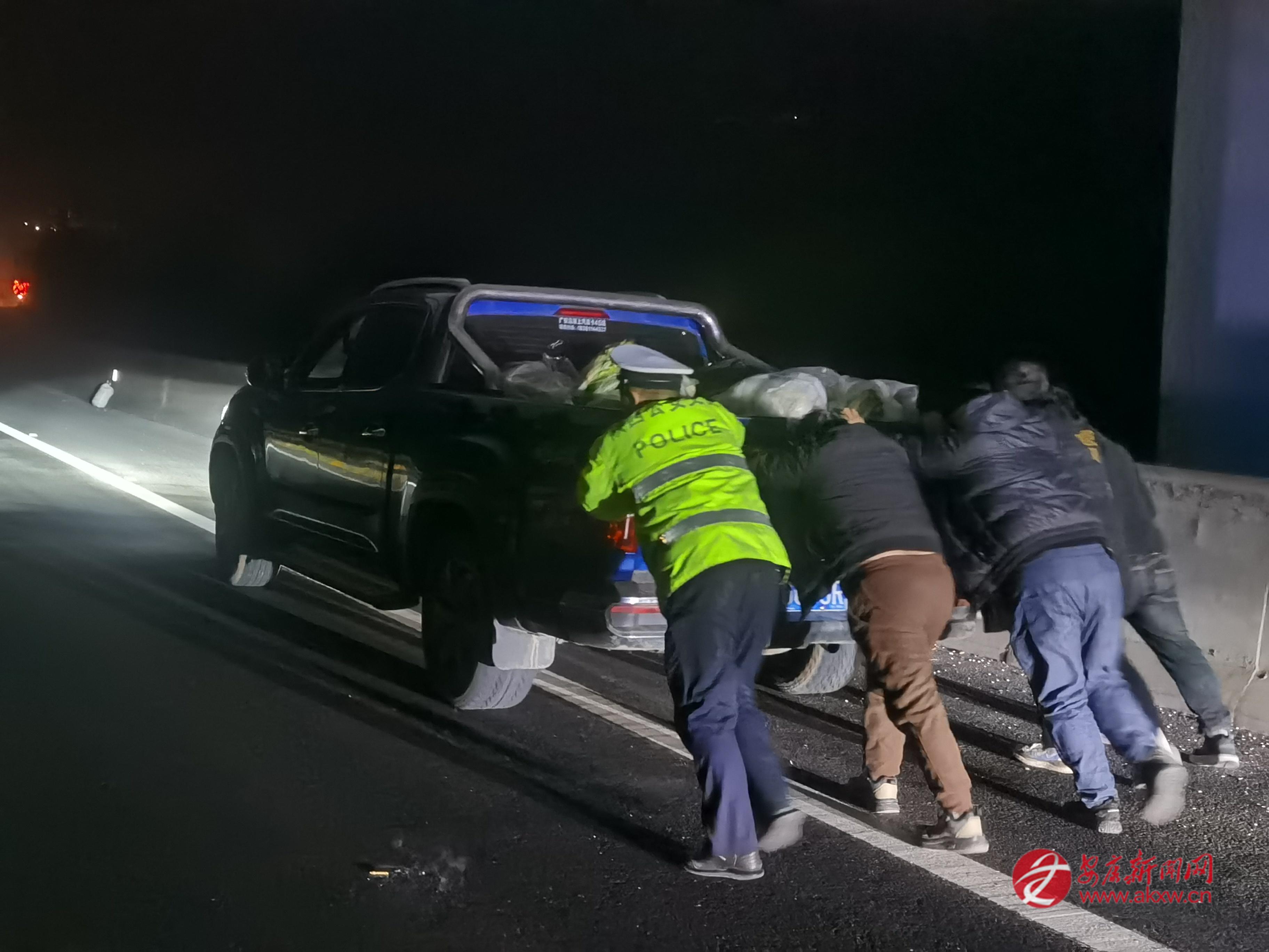 面對這一突發(fā)險情,執(zhí)勤民警立即開啟警燈、鳴響警笛,在來車方向150米處規(guī)范擺放警示標(biāo)志,設(shè)置安全防護(hù)區(qū)域,并指揮后方車輛減速慢行,有效防范二次事故發(fā)生。經(jīng)初步檢查,該車因故障已完全喪失動力,現(xiàn)場無法修復(fù),且故障點距離前方雙河收費站僅300余米。考慮到春運期間路面清障資源緊張、拖車抵達(dá)耗時較長,為迅速消除隱患、保障春運通行效率,民警在確保安全的前提下,克服車輛自重較大、夜間視線不佳、周邊車流復(fù)雜等情況,聯(lián)合車內(nèi)人員合力徒手將故障車輛平穩(wěn)推至收費站外安全區(qū)域,及時恢復(fù)了匝道正常通行。