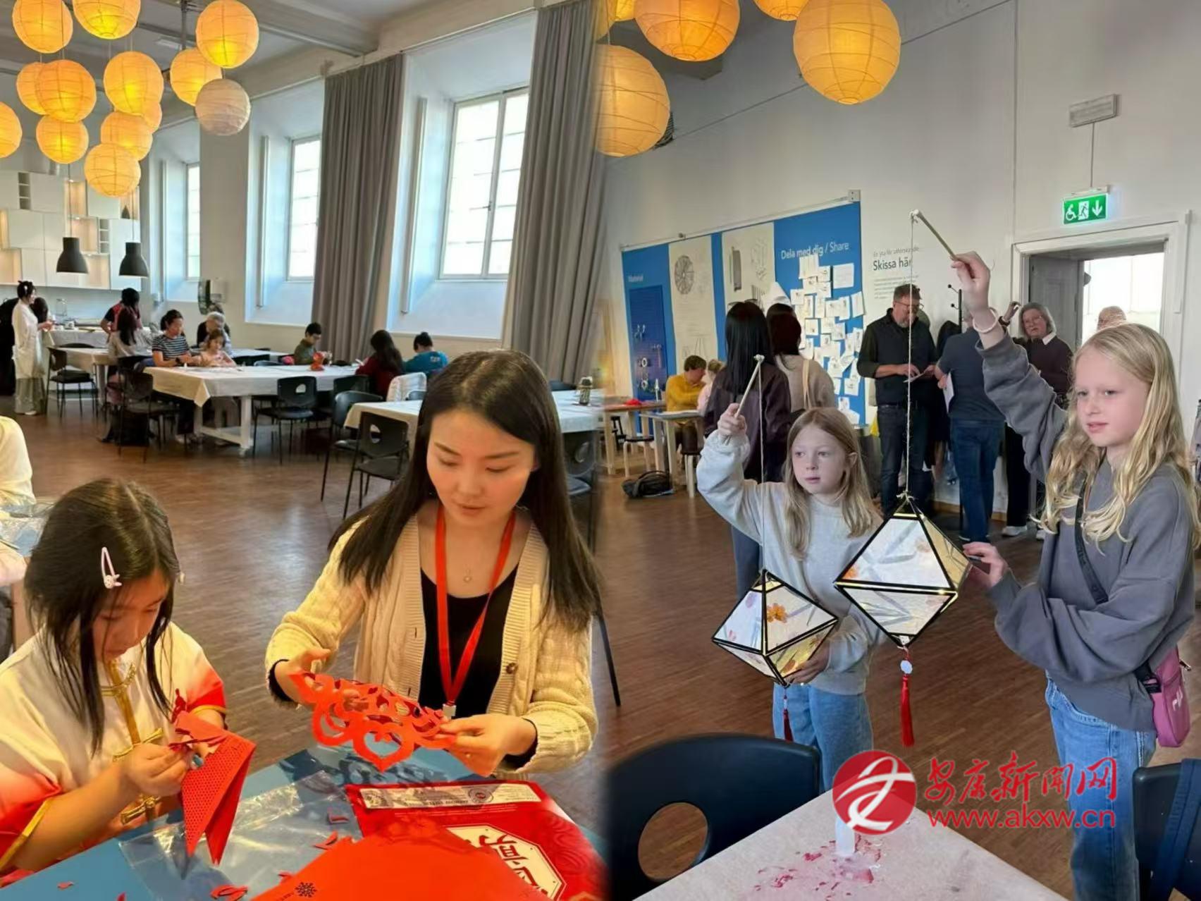 2025年中秋節(jié),邱萌受邀參加哥德堡總領(lǐng)館舉辦的文化活動,在哥德堡市立博物館的展廳里,她教當(dāng)?shù)睾⒆觽冏鰺艋\、剪剪紙。邱萌和孩子們一起用宣紙折疊成燈籠,讓瑞典人得以近距離觸摸中國節(jié)日。有人好奇地問起中秋的月亮,她便講起嫦娥奔月的傳說,講起月餅的寓意,講起“千里共嬋娟”的詩句。博物館里點亮了許多盞燈籠,每一盞都映照著孩子們專注而好奇的臉龐。