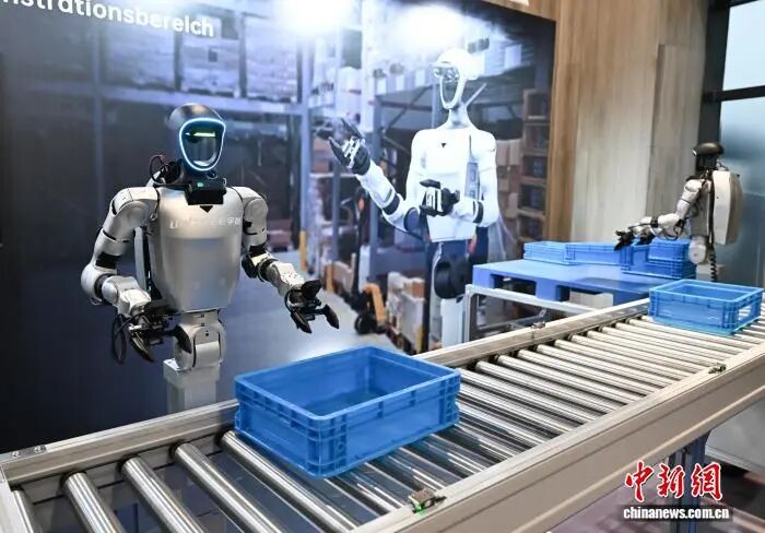 資料圖:宇樹科技人形機(jī)器人模擬流水線生產(chǎn)場景。中新社記者 王剛 攝