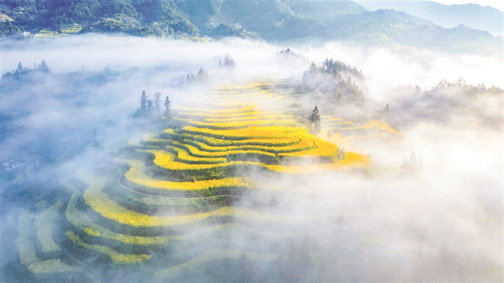 沿著蜿蜒的山路盤旋而上,轉(zhuǎn)過一個(gè)山坳,眼前豁然開朗——那金黃的油菜花,竟從山腳一直鋪到云端。層層疊疊的梯田,依著山勢盤旋而上,每一道田埂都勾勒出柔美的曲線。油菜花便順著這些曲線,開得浩浩蕩蕩,開得理直氣壯。晨霧未散時(shí),花海在薄紗般的霧氣里若隱若現(xiàn),恍若仙境;待太陽升高,霧氣褪去,那金黃便愈發(fā)耀眼,直晃得人瞇起眼睛。風(fēng)過處,花浪翻涌,從這山傳到那山,沙沙的聲響里,滿是春天的氣息。