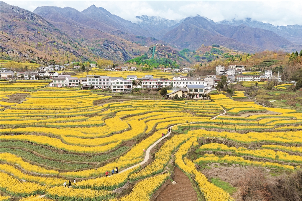 3月18日,鳳凰山巔殘雪未融,山下鳳堰梯田油菜花已進(jìn)入盛花期。 陳軍 攝