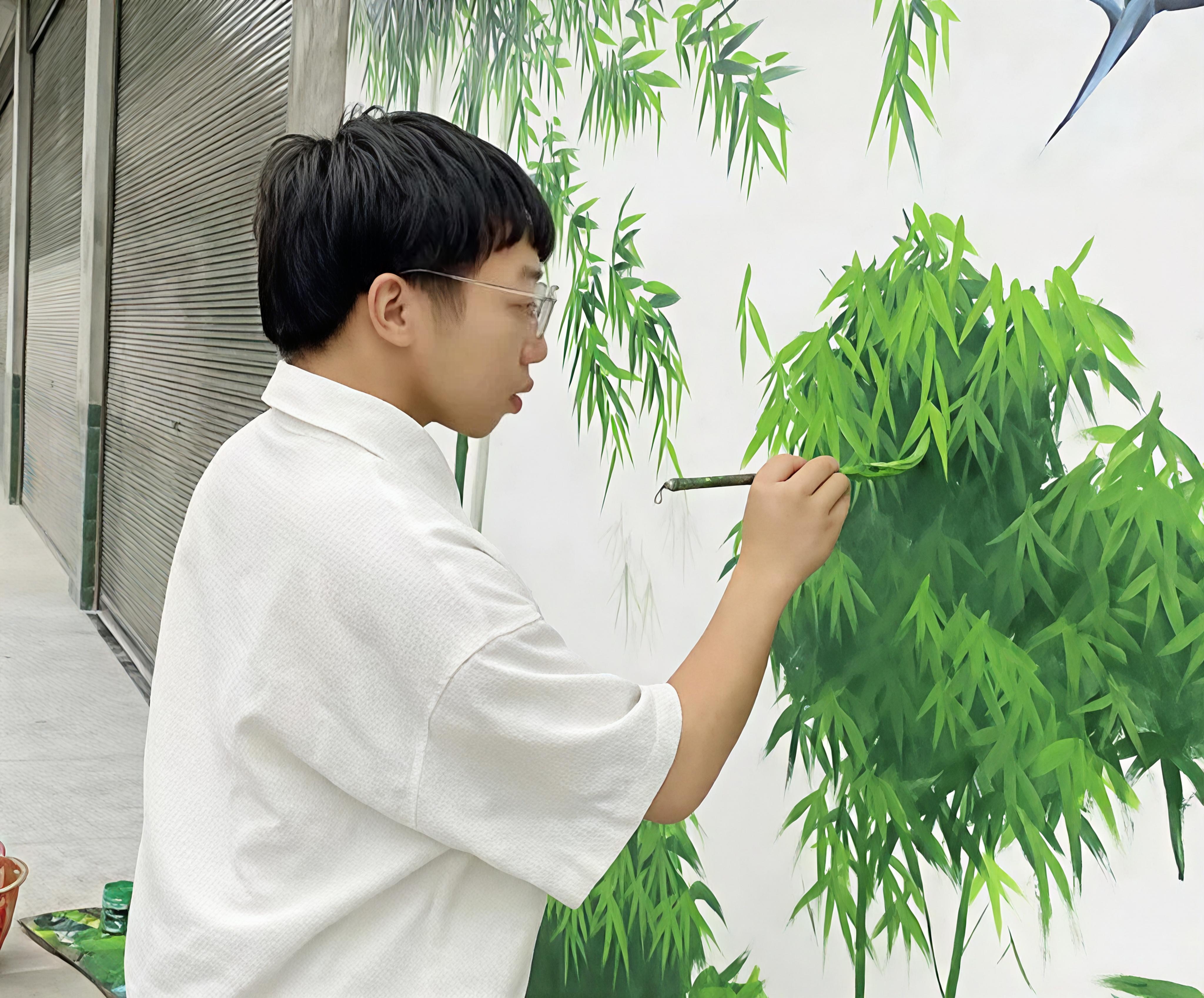 張家壩村,1998年出生的游乙山正蹲在墻角專注創(chuàng)作,不多時,一面栩栩如生的文化墻便呈現(xiàn)眼前,與青山綠水、整潔街道相映成趣,勾勒出鄉(xiāng)村振興的美好畫卷。這位土生土長的正陽青年,畢業(yè)于湖南文理學(xué)院,憑借扎實繪畫功底,在鄰縣創(chuàng)辦“藝山美學(xué)館”,從事美術(shù)培訓(xùn)和墻體彩繪。