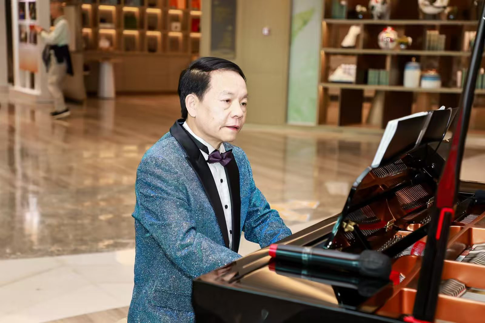 “第二點(diǎn),共鳴腔體?!彼檬种篙p點(diǎn)自己的胸腔、喉部、口腔、頭腔,“這四個(gè)位置,就是你的聲音工廠。聲音不是從嗓子里硬擠出來的,是共振出來的?!敝v到興頭上,他干脆現(xiàn)場示范了一段《草原之夜》的引子,高亢透亮的男高音在劇場中回蕩,每一個(gè)音符都清晰得如同落在耳畔。喝彩聲尚未平息,他又邀出他的學(xué)生、平利縣文化館館長陳尚忠。師生二人即興合奏,琴聲與人聲交織,40余年的師生情誼在旋律中靜靜流淌。