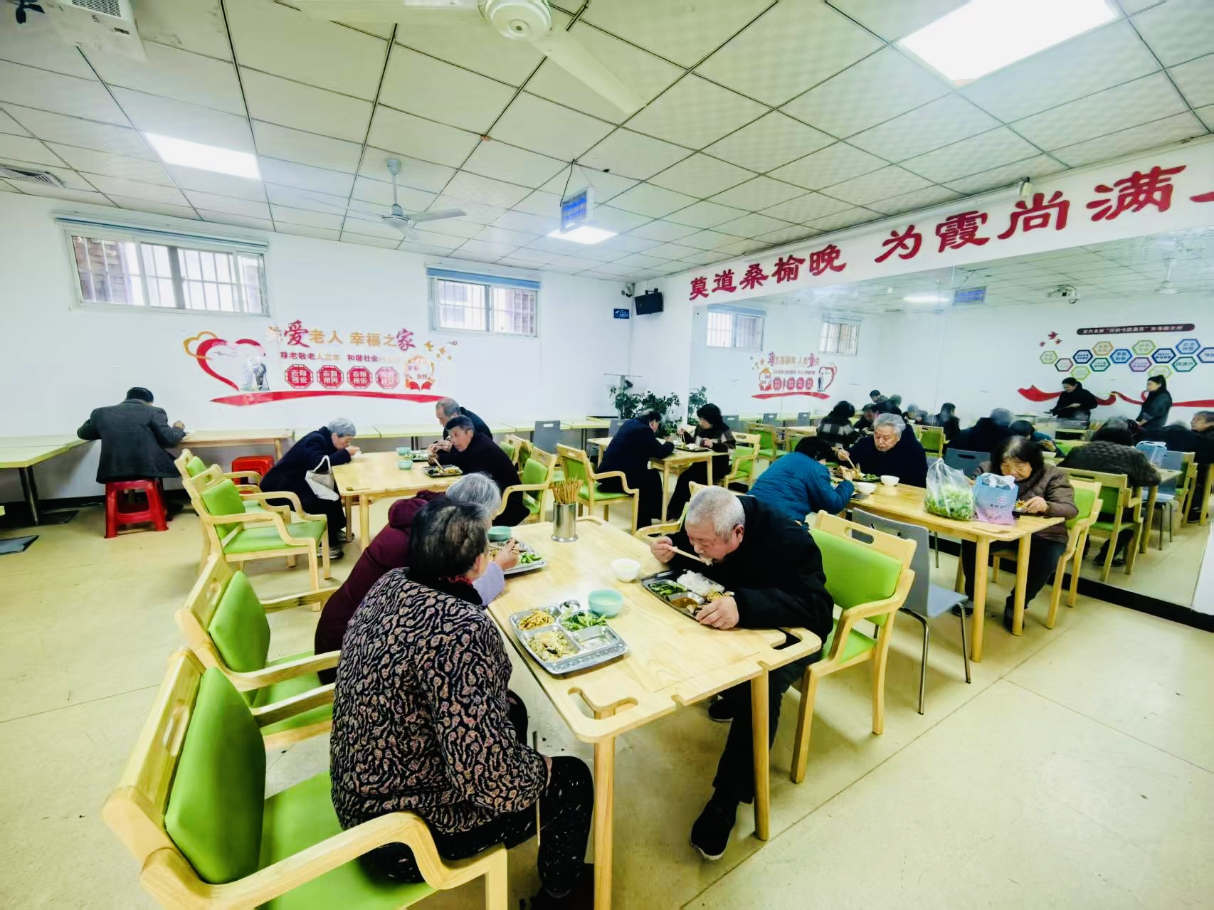 “開飯咯!”隨著廚師一聲洪亮的吆喝,社區(qū)里的老人不約而同地起身,邁著慢悠悠的步子走向餐廳。不一會兒,一道道家常菜肴就端上了桌:清炒油麥菜脆嫩爽口,酸辣土豆絲開胃解膩,豬肉燉粉條燉得軟爛,老人不用費牙就能咬動,再配上一碗熱氣騰騰的排骨湯,三菜一湯,葷素搭配,既可口又有營養(yǎng)。