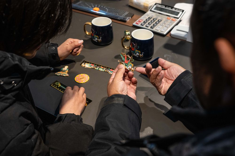 2026年1月15日,云南麗江白沙壁畫博物館館長(zhǎng)楊志堅(jiān)(右)與同事討論文創(chuàng)產(chǎn)品設(shè)計(jì)。近年來(lái),白沙壁畫博物館持續(xù)推動(dòng)白沙壁畫赴廣東、上海等地展覽,主持編纂畫冊(cè),并推進(jìn)數(shù)字化采集和文創(chuàng)開(kāi)發(fā),讓壁畫藝術(shù)以新的形式走進(jìn)人們的日常生活。