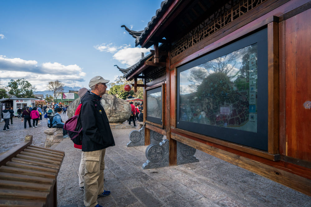 2024年3月23日,游客在麗江古城內(nèi)查看電子導(dǎo)覽大屏。云南省麗江市近年充分應(yīng)用5G、物聯(lián)網(wǎng)、大數(shù)據(jù)、人工智能等數(shù)字化技術(shù),大力推動(dòng)智慧旅游發(fā)展,提升服務(wù)水平和游玩體驗(yàn),為當(dāng)?shù)匚穆卯a(chǎn)業(yè)發(fā)展注入新活力。