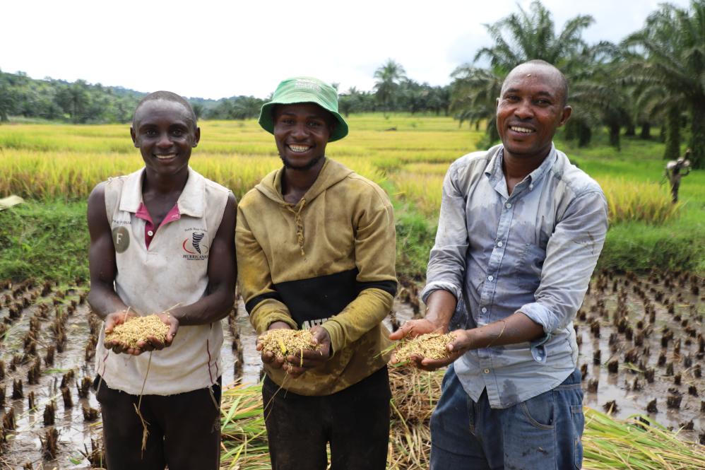 3月25日,在布隆迪布瓊布拉省姆潘達(dá)縣,當(dāng)?shù)剞r(nóng)業(yè)技術(shù)員麥樂(lè)斯(右)與附近農(nóng)戶(hù)們手捧剛剛收獲的稻粒。新華社記者 鞠銀河 攝