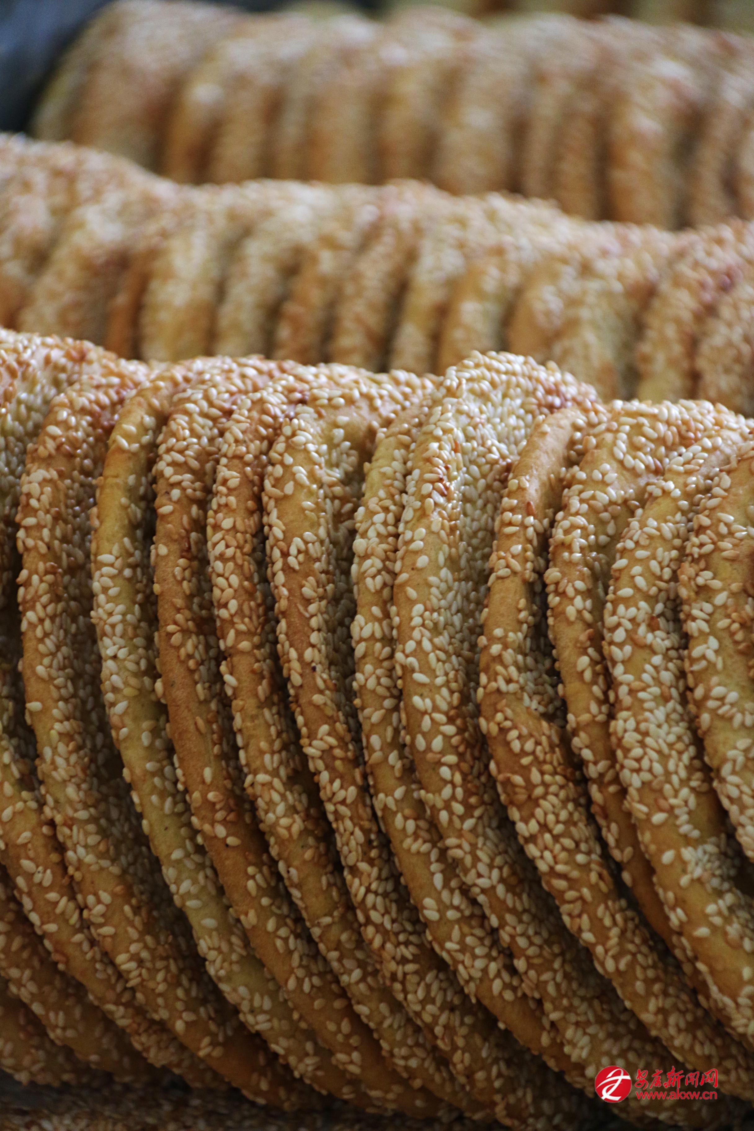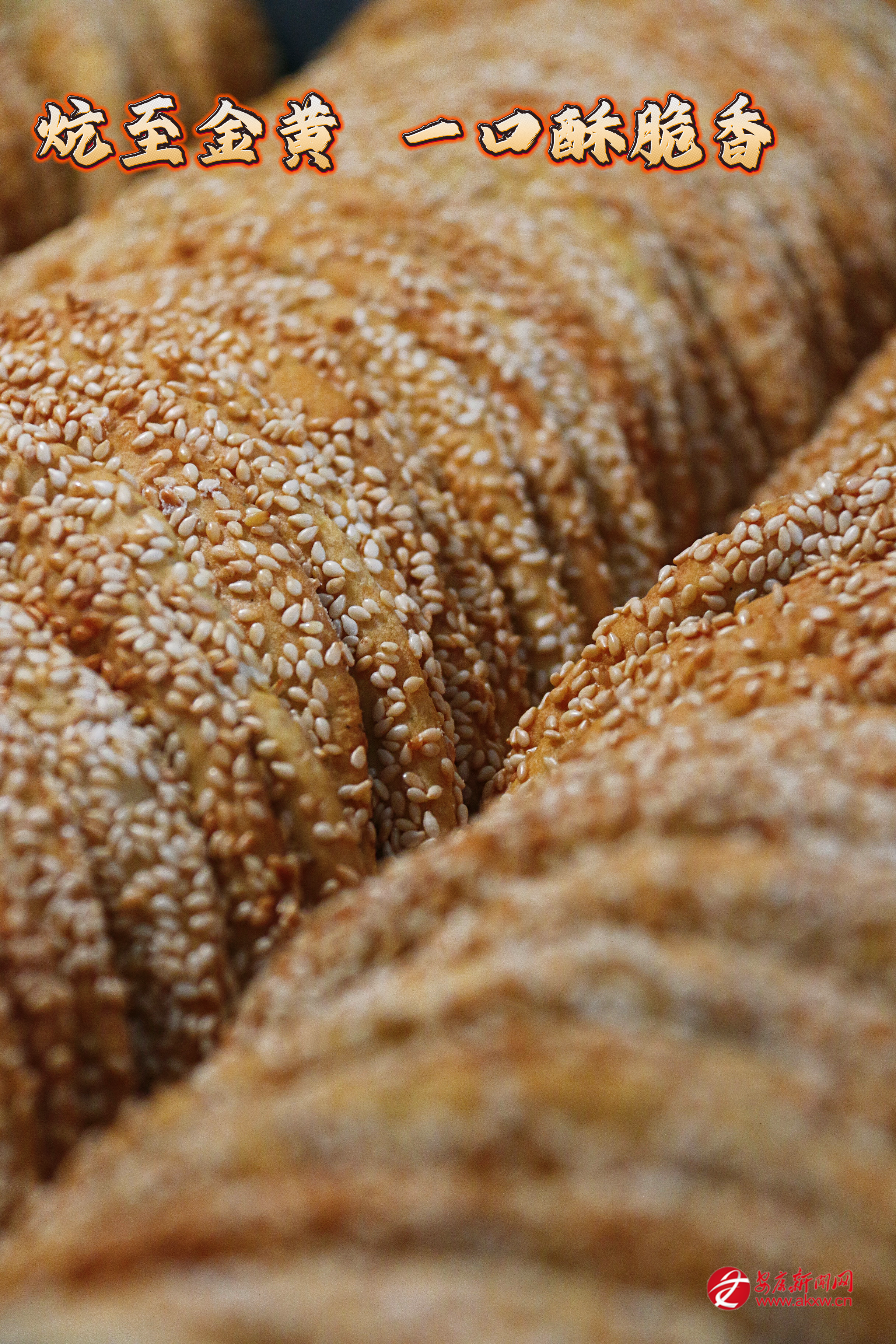 炕炕饃最講究的是“酥”。這酥不是靠油多硬炸出來的,而是用油酥一層一層疊進(jìn)去的。做油酥得用豬油和菜油兩樣,再配上五香粉,小火炒得噴香。面團(tuán)是老面發(fā)的,揉到光潤,再把油酥裹進(jìn)去,搟開,折起,再搟開,反復(fù)好幾回。這時候的面已經(jīng)有了一層層薄薄的紋理,像書頁似的。搟好的餅坯中間薄、四周略厚,抹一層水,粘上白芝麻——可以只粘一面,叫“一面麻”;也可以兩面都粘,叫“二面麻”。然后放進(jìn)一種特制的鐵鏊子里,上下都有炭火,夾著慢慢炕。中間還得翻一兩次身。