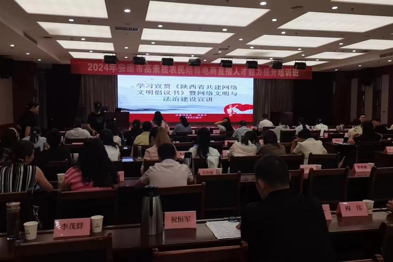 ? ? ? 5月28日,安康市高素質(zhì)農(nóng)民培育電商直播人才能力提升培訓(xùn)班如期開班,市委網(wǎng)信辦參加活動(dòng)并就“踐行網(wǎng)絡(luò)文明 弘揚(yáng)網(wǎng)絡(luò)誠(chéng)信”做專題宣講培訓(xùn)。