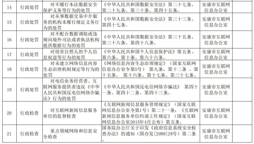安康市互聯(lián)網(wǎng)信息辦公室行政執(zhí)法事項目錄清單