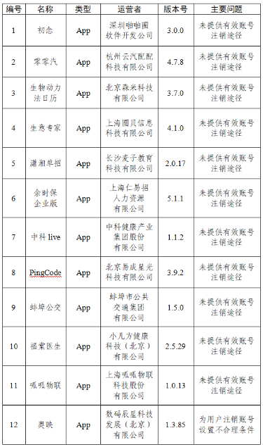 四、初念、零零汽等12款App未提供有效賬號注銷途徑或為用戶注銷賬號設置不合理條件(詳見下表)。