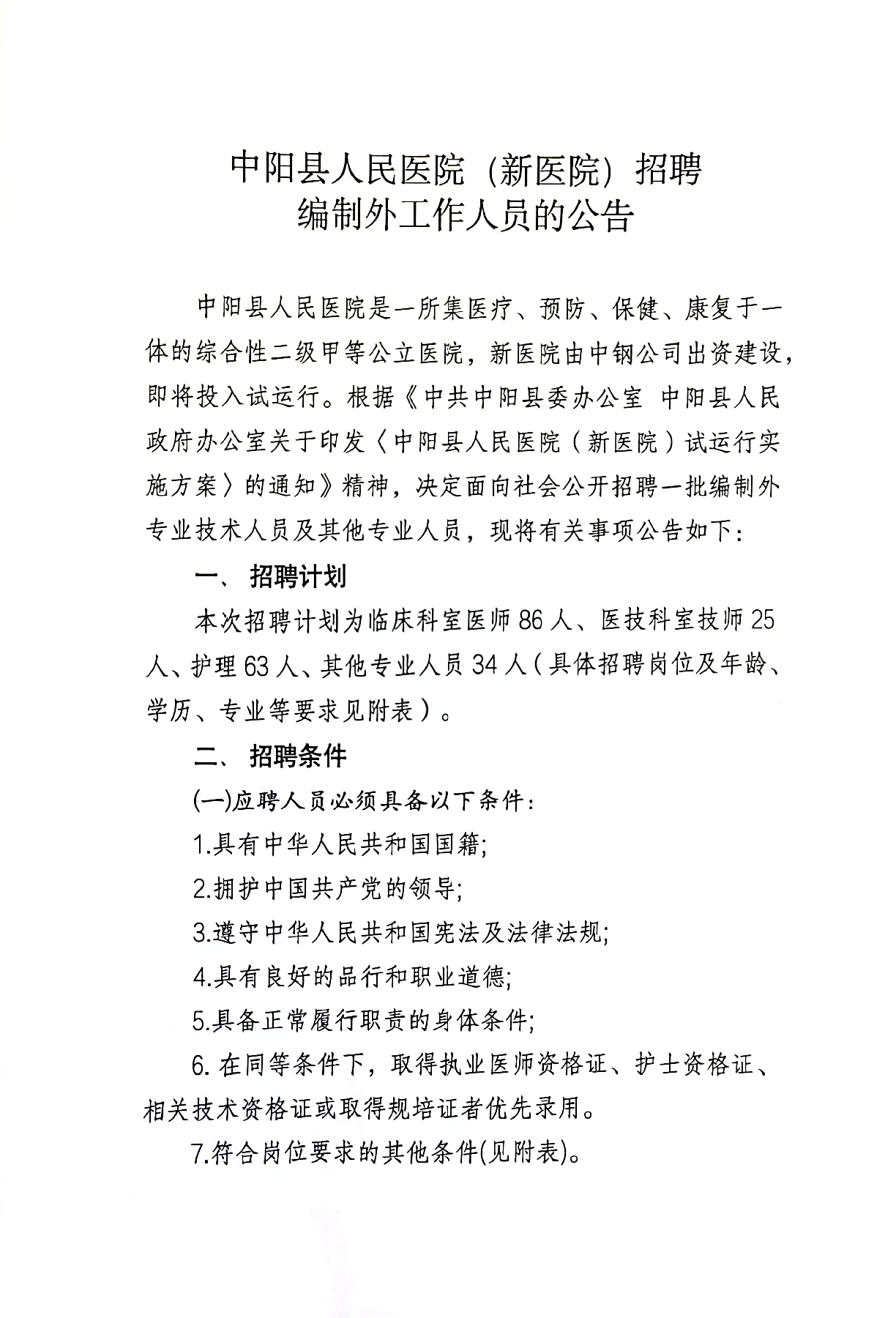 中陽(yáng)縣人民醫(yī)院(新醫(yī)院)招聘公告